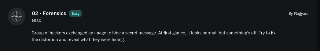 A group of hackers exchanged an image to hide a seceret message. At firsist glance it looked normal but something was off....try to fix the distorition and reveal what they were hiding ?